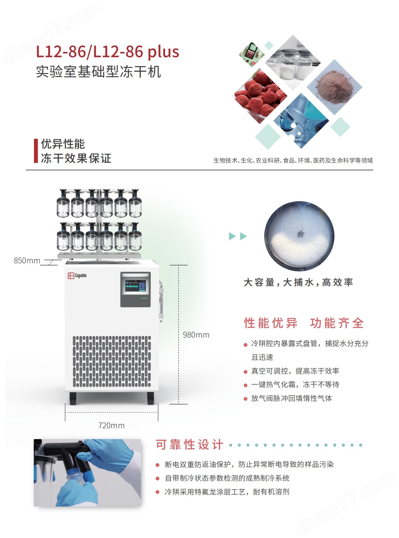 1、冷阱温度达-86℃,捕水效率高,冻干速度快,满足大容量样品需求